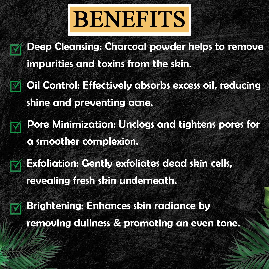 Activated charcoal acts like a magnet, attracting toxins, impurities, and excess oils, leaving your skin deeply cleansed and refreshed. Regular use can help reduce blackheads, acne, and dullness, giving you a naturally radiant and healthy look.